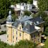 The Villa Rauhenstein stands at the base of castle ruins, featuring a grand historicist architectural design with multiple floors and distinct decorative elements.