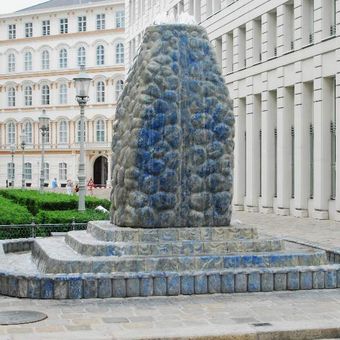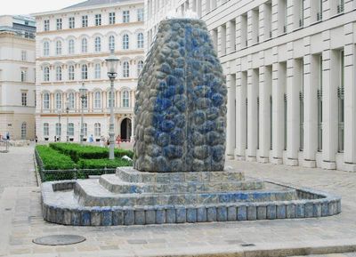 The Wasserwellen-Lebens-Brunnen stands on a three-tiered pedestal near Ballhausplatz, featuring a surface designed to resemble natural stones with rounded edges.