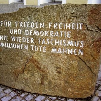 The memorial's inscription in German language emphasizes the commitment to peace, freedom, and democracy while serving as a reminder of the millions who died.