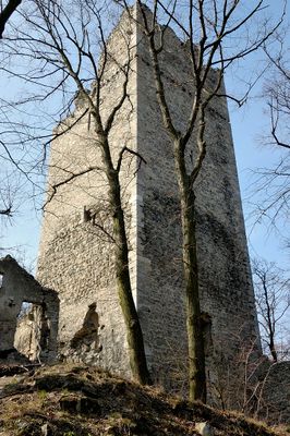 The fortress features a quadrangular keep measuring 26.5 meters in height with walls 3.5 meters thick, constructed from rubble stone with dressed corner blocks.