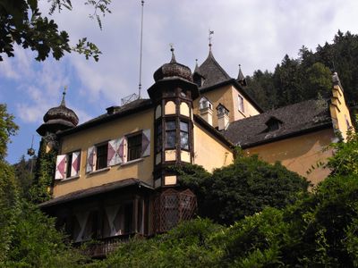 The structure includes varied floor heights, verandas, and polygonal corner projections, making it stand out among Tyrolean heritage buildings.