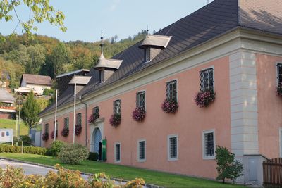 Schloss Neupernstein is a castle with multiple event spaces located in Kirchdorf an der Krems. The main hall accommodates about 250 people, while a smaller hall seats around 100, and the entire complex consists of several buildings arranged around a central courtyard.