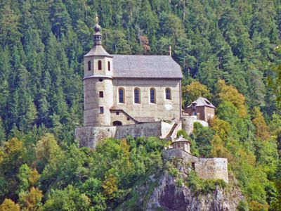 The Wallfahrtskirche Maria Freienstein stands on a narrow rocky plateau approximately 120 meters above the town of Sankt Peter-Freienstein, incorporating elements of a former fortress.