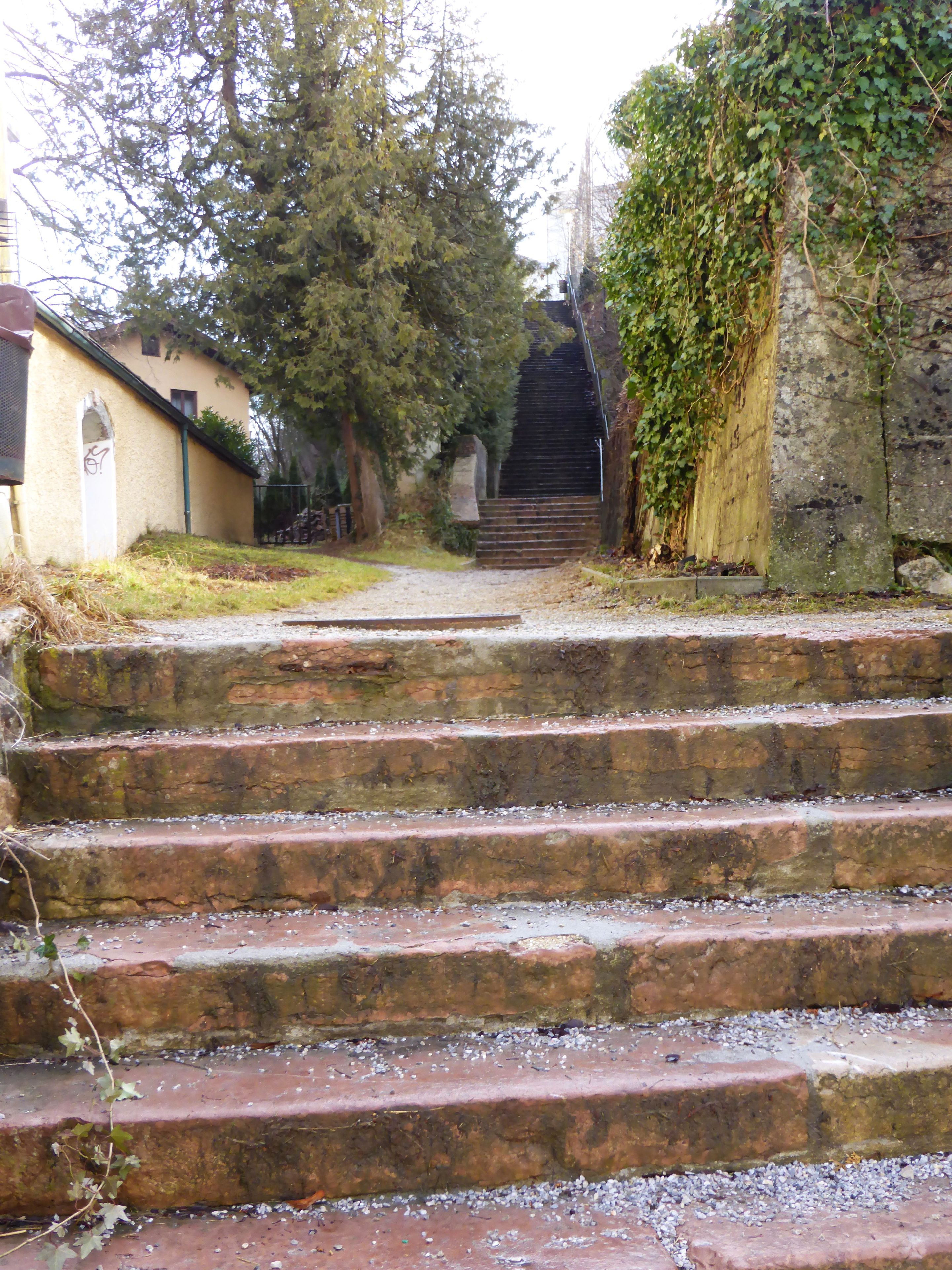 Located on Schützengasse street at coordinates 47.678512, 13.092929, the staircase provides access to the elevated position of the former monastery grounds