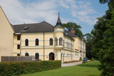 Schloss Bergheim functions as an educational institution within a historical building structure, featuring traditional architectural elements and modern classroom facilities.