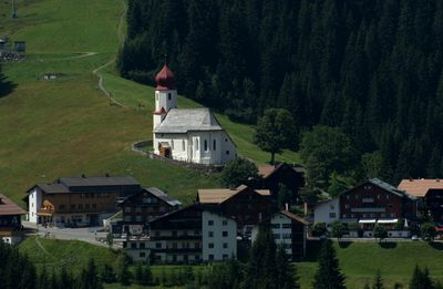 The Parish Church of St. Nicholas is a Catholic church in Damüls situated at about 1,429 meters (4,688 feet) elevation with Gothic architecture and a baroque bell chamber. The building features pointed arch windows along its south side and exemplifies careful religious architectural design from this period.