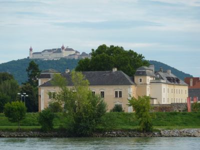 The north wing retains foundations from a 13th-century medieval tower and displays late Baroque window treatments along its Danube-facing facade.