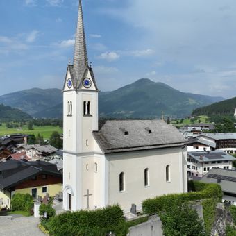 Parish Church of St. Margaret sits on a rocky hilltop and commands views across the Kaprun valley toward the Kitzsteinhorn glacier and mountain reservoirs. The structure features a whitewashed choir section and a slender tower rising above the surrounding Alpine terrain.