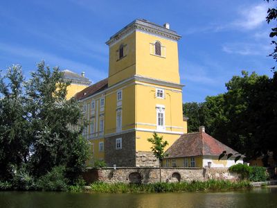 The castle stands on an island formed by a dammed branch of the Russbach river, surrounded by a moat system.