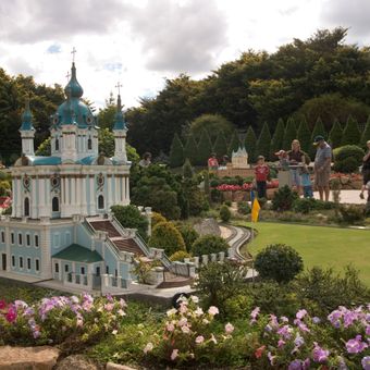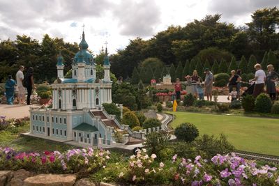 The gardens display miniature replicas of buildings from 30 countries within landscaped grounds, complete with a steam train and detailed figurines.
