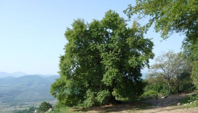 The Tnjri stands as an Oriental plane tree with a massive trunk and extended branches reaching across the landscape near Şıx Dursun village.