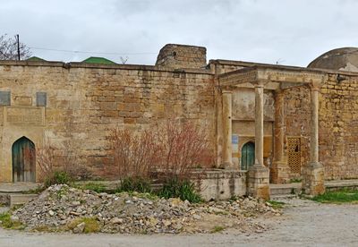 The Nizameddin Mosque features stone walls, domed structures, and minarets following traditional Shirvan-Absheron architectural principles from Azerbaijan's medieval period.