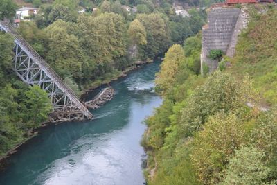 The destroyed railway bridge spans across the Neretva River, standing as a remnant of the World War II battle that took place in this region.