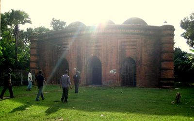 The mosque sits on the western bank of the Thakurdighi river about 320 kilometers from Dhaka and is protected as part of a larger archaeological complex. Access is straightforward and the site receives regular maintenance from the Department of Archaeology, Bangladesh.