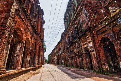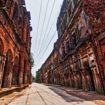 Panam City is an ancient settlement in Bangladesh characterized by rows of two-story brick buildings arranged along a main street. The structures blend colonial and local architectural styles, with each building featuring a similar design that reflects a planned layout from the past.