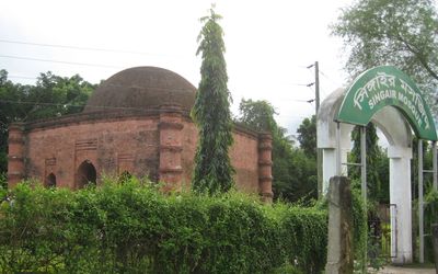 The Singar Mosque features a square layout with a central dome, red brick walls, and intricate terracotta decorations throughout its structure.