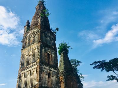 The religious complex comprises three remaining structures of varying heights, with the tallest featuring ornate decorations and pagoda-style architecture at its upper portion.
