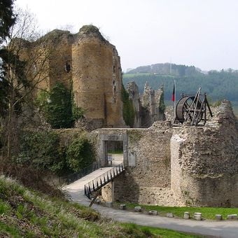 Franchimont Castle is a medieval fortress perched on a hilltop in Theux, built with thick stone walls, defensive towers, and gates overlooking the valley. The structure uses the natural rock formation as its foundation and demonstrates strategic positioning for military defense.