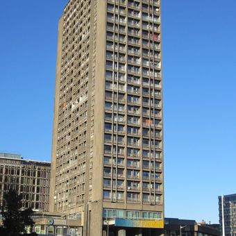 Résidence Kennedy is a 84.4 meter residential tower with 28 floors and 217 units, including 102 studio apartments of various sizes. The structure divides into separate wings that each house different types of accommodation arranged vertically throughout the building.