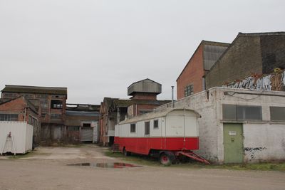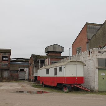 The factory's remaining structures include worker housing units and workshops, with the preserved chimney standing as a reminder of Hasselt's manufacturing heritage.