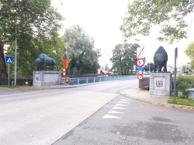 The bridge stands as a memorial with two bronze bison sculptures, representing the emblems of the Canadian regiment that freed the city.