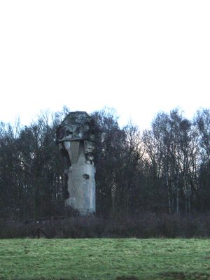 An air intake tower stands at the forest edge near the fort, marking one of the few visible remnants of its original ventilation system.