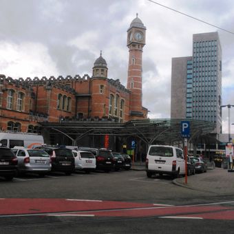 The Virginie Loveling building is a modern administrative complex in Ghent featuring a 90-meter-high tower with 22 floors alongside a lower horizontal wing that together form an L-shaped structure. The facility spans roughly 38,000 square meters of office space, includes underground parking, and connects directly to the adjacent train station.