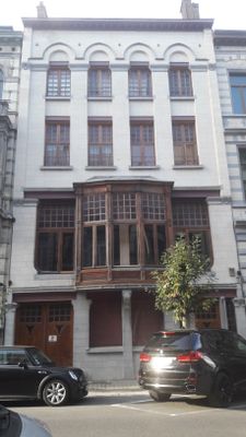 The building stands at 50.827342 latitude and 4.360269 longitude, near other Art Nouveau structures in the Ixelles district of Brussels.
