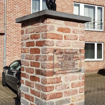The statue maintains its original patina and stands in contrast to modern surroundings, creating a connection between past and present Westmeerbeek.