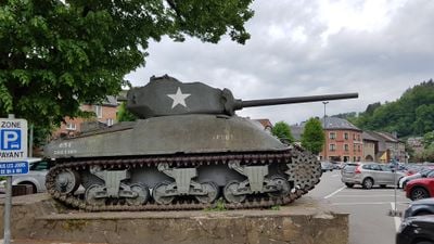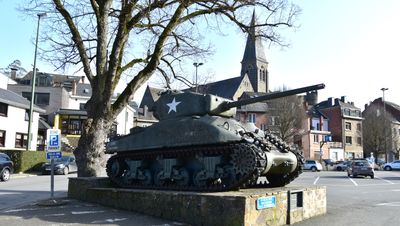The Belgian 1/3 Lancers Regiment installed this tank in 2004 to commemorate the 60th anniversary of the Battle of the Bulge and the liberation of La Roche-en-Ardenne.