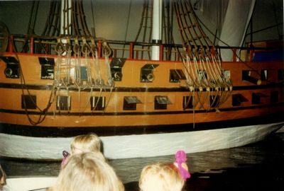 Passengers traveled through various scenes in boats while following the narrative of Tintin's quest for the Unicorn ship's treasures.