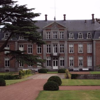 Kasteel Ten Bieze stands as a rectangular structure with double staircases leading to central doors, featuring eleven frontons displaying heraldic symbols.