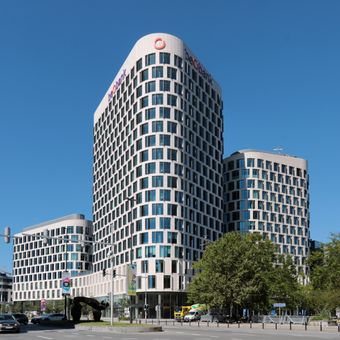 The complex houses a cultural center alongside offices, turning the space into a place where work and public events happen together. This mix helps the surrounding neighborhood feel like more than just a business area.
