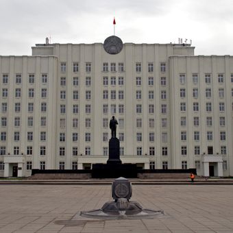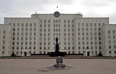 The House of Soviets stands as a five-story stone structure with symmetrical wings, large columns, and wide staircases leading to the main entrance.