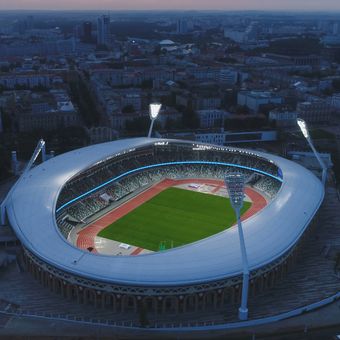 Dinamo Stadium features an oval-shaped structure with a modern canopy covering 80 percent of its 22,246 seats and advanced LED lighting systems.