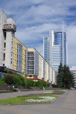 The building's postmodern design intentionally stands apart from the surrounding architecture in central Minsk, creating visual contrast with older structures nearby. This makes it a recognizable landmark when exploring the city's evolving skyline.