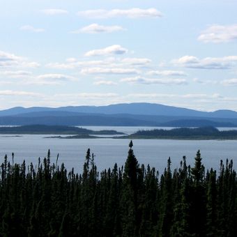 The Daniel Johnson Dam regulates water levels and generates electricity through several power stations along the river. The area is remote, and access roads mainly lead to the power generation facilities and a few viewpoints along the shore.