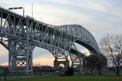 The structure combines cantilever and continuous bowstring arch designs, with the main span extending 281 meters over the St. Clair River.