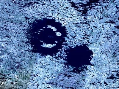 Wiyâshâkimî Lake consists of two circular bodies of water formed by separate asteroid impacts, measuring 26 and 36 kilometers in diameter respectively.