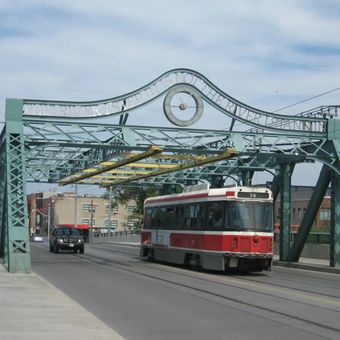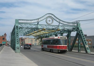 The Queen Street Viaduct spans 129 feet across the Don River with four traffic lanes and double streetcar tracks on its metal structure.