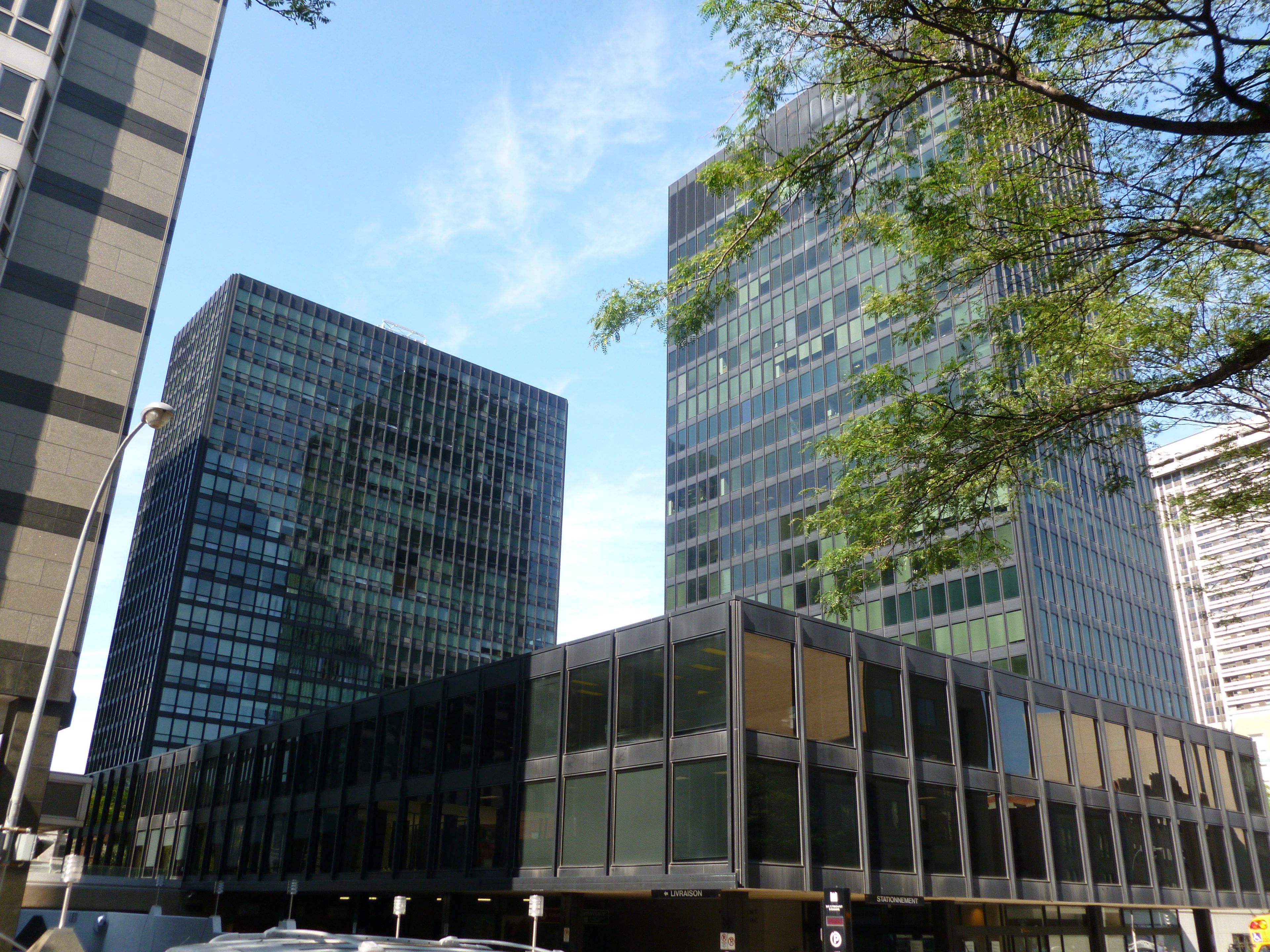 The buildings connect directly to Atwater Metro station, Place Alexis Nihon, and Dawson College through an underground tunnel system for winter protection.