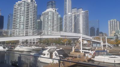 The bridge provides pedestrians with direct access between waterfront destinations while offering elevated views of Toronto's inner harbor and docking facilities.