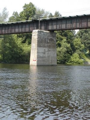 The Canadian Northern Ontario Railway Federal Bridge extends across the Rideau River with five spans supported by four concrete piers in the water system.