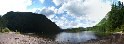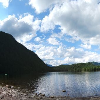Davis Lake Provincial Park spans 185 acres with forest paths, beaches, and lake waters among Western Hemlock trees in British Columbia.