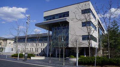 The central administrative building features modern architecture with glass panels, open spaces, and a grand entrance facing Carden Street.