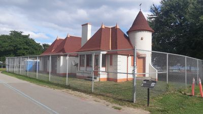 Joy Gas Station is a former fuel station in Ontario with a white circular tower topped by a conical roof, reflecting 1930s commercial chateau design. The structure was relocated to Sir Casimir Gzowski Park in 2007 and underwent extensive restoration work.