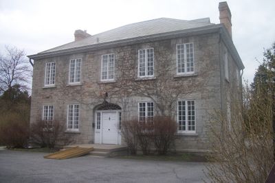 The two-and-a-half-story stone house features a symmetrical five-bay facade, hipped roof, and two end chimneys in British classical architectural style.