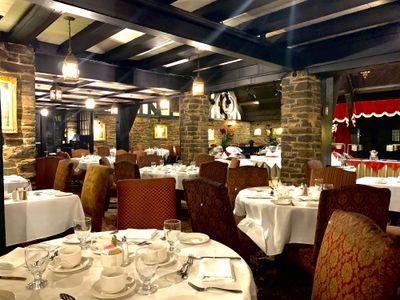 Old Mill Toronto is a restaurant and inn in The Kingsway neighborhood featuring dining spaces with wooden beams, stone walls, and views of gardens throughout the building. The property includes multiple distinct areas that offer different experiences, from intimate corners to larger gathering spaces.