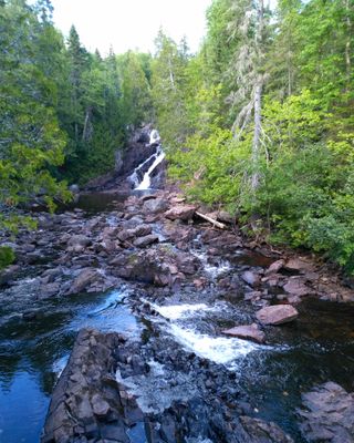 The Rainbow Falls Trail extends 1.1 kilometers with dedicated platforms and stairs, leading to elevated viewpoints overlooking Lake Superior.