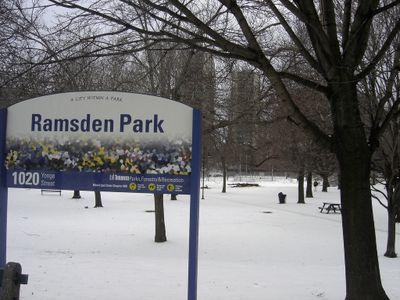 Ramsden Park spans 13.7 acres of green space between Yonge Street and Avenue Road, featuring playgrounds, basketball courts, and hockey rinks throughout its grounds.